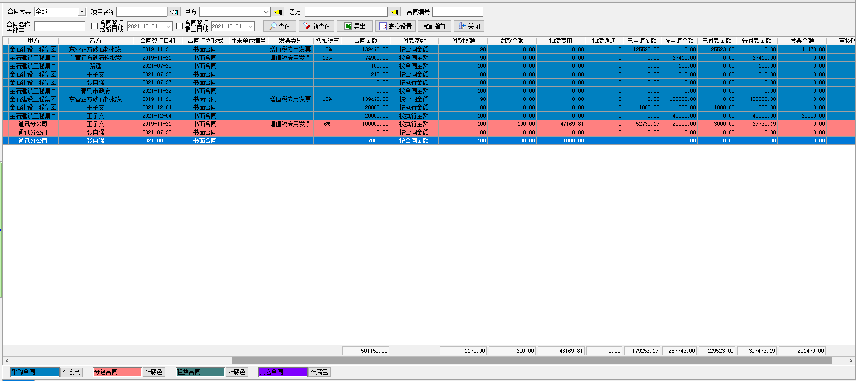 查詢內容包括:合同基礎信息(時間、甲乙方)、發票信息(類別、稅率)、金錢往來(付款、罰款、扣繳、已付款、未付款等信息)