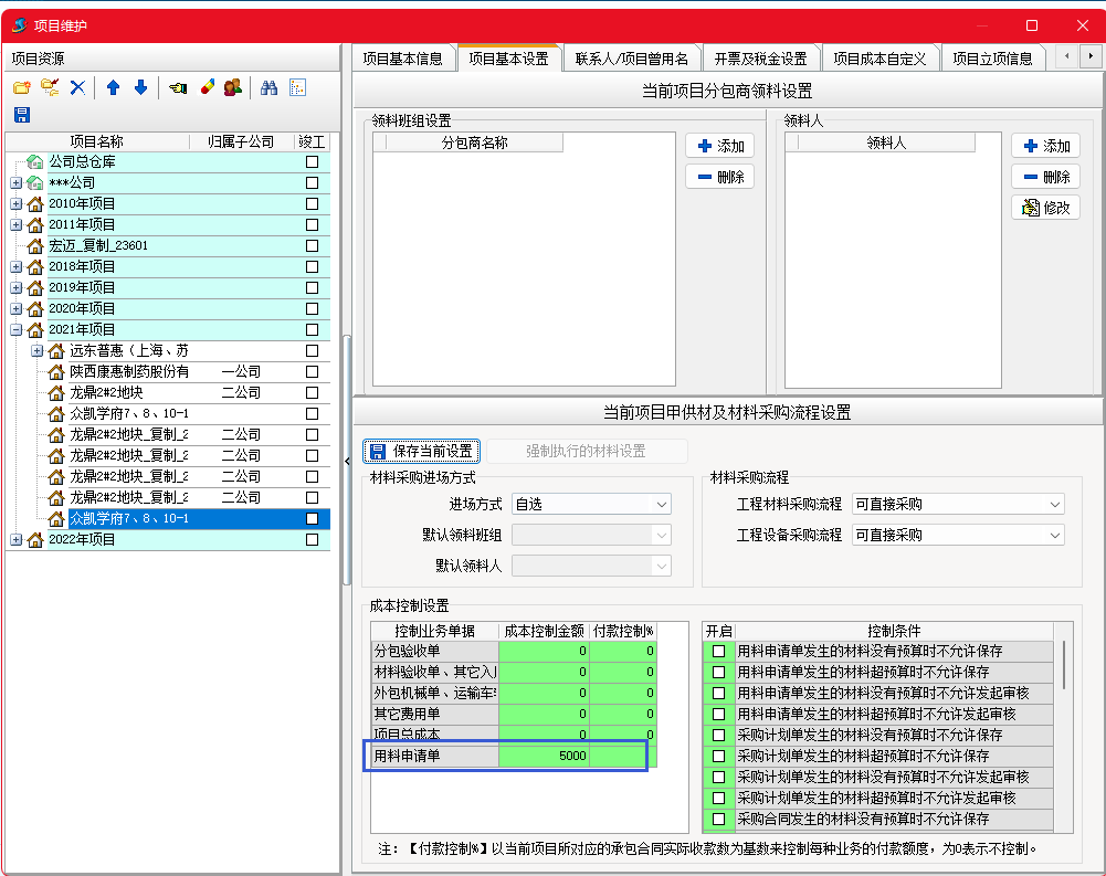 金石工程管理軟件新增用料申請控制功能