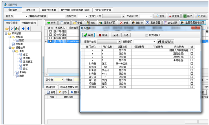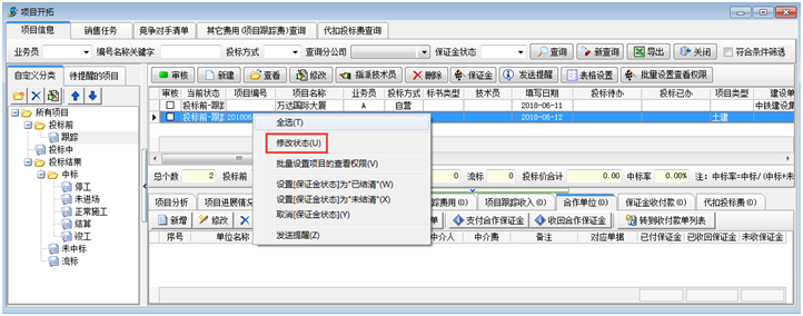 2. 填寫項目開拓的相關信息記錄(項目分析、項目進展情況、競爭對手、項目資料、項目跟蹤費用、項目跟蹤收入、項目合作單位、保證金,代扣投標費等)。