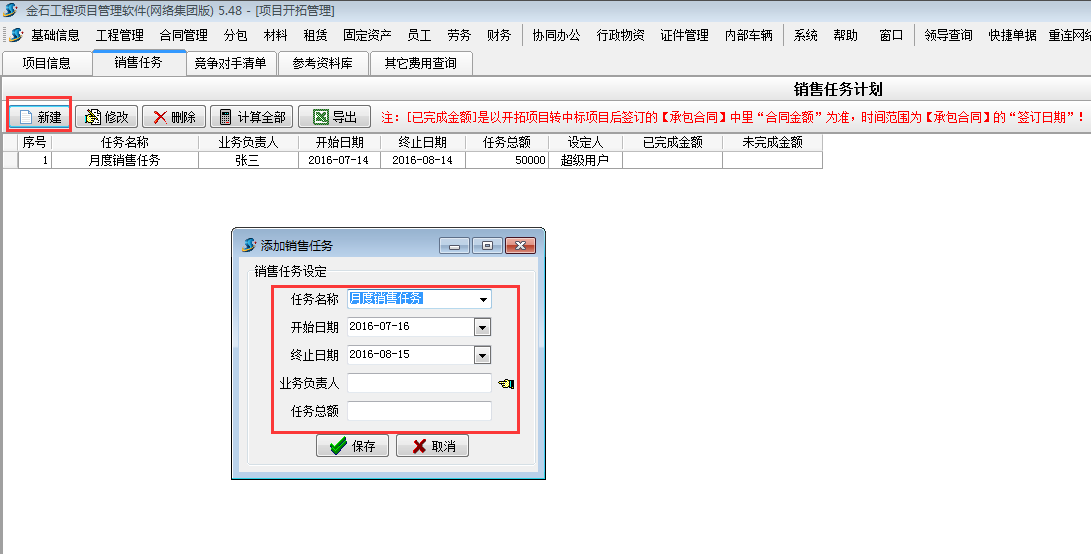 首先在施工項目管理軟件【項目開拓】-【銷售任務】處新建銷售任務計劃。如下圖: