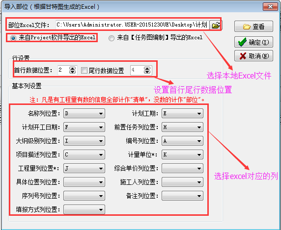 上圖為來自project軟件導出的excel格式。在進度管理中導入時選擇好本地excel文件,設置好首行尾行數據位置,選擇好對應excel表中各列位置,即可選擇確定導入,如下圖: