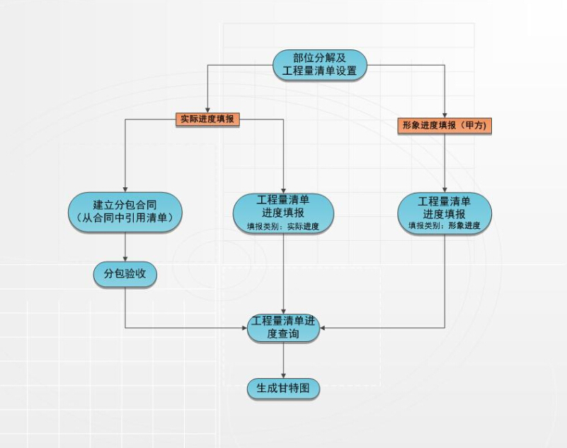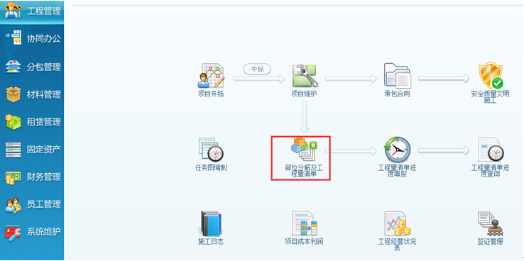 工程項目管理系統中進行項目進度查詢時,系統會根據項目部分以及工程量清單匯總項目進度。如圖: