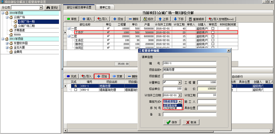 (1)工程量清單編輯中的填報方式分“進度填報單”或“分包驗收單”,公司自己做的工程量填報方式為“進度填報單”,分包出去的工程在選擇的填報方式為“分包驗收單”。(2)若項目的部位名稱有變動,可在系統中隨時更改,與此部位相關的單據涉及到的部位名稱會隨變動而更改。