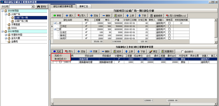 (2)由于某種原因工程不再繼續進行,但是完成的工作量小于設置的工程量,此時需要在【部位分解工程量清單設置】中手動設置清單為“完成”狀態。如圖: