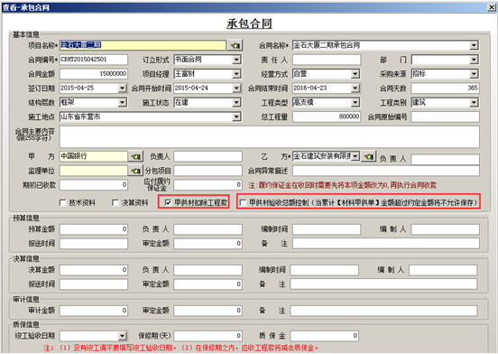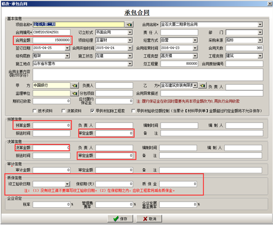 在編輯合同內(nèi)容時一定要注意填寫“合同金額”、“預(yù)算信息”里面的“預(yù)算金額”“審定金額”,“決算信息”里面的“結(jié)算金額”“審定金額”,如果有質(zhì)量保證金,則輸入“竣工日期”“保修期”以及“質(zhì)保金”金額。