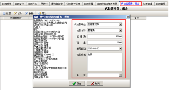 代扣管理費(fèi)稅金扣除的是我方借別的公司的資質(zhì)扣除的費(fèi)用,根據(jù)發(fā)票金額扣除的費(fèi)用稅金以及罰款以外的扣款。選中承包合同,點擊“代扣管理費(fèi)、稅金”如圖: