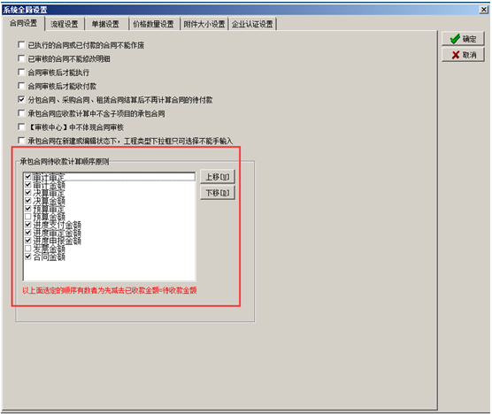 當(dāng)前合同應(yīng)收款在“全局設(shè)置”-“承包合同代收款計算原則”確定,進(jìn)入系統(tǒng)的“系統(tǒng)維護(hù)”-“系統(tǒng)全局設(shè)置”-“合同設(shè)置”-“承包合同代收款計算順序原則”(從上到下以打鉤且不為零為準(zhǔn)),如圖: