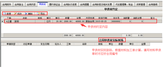 “甲供材料扣除工程款”是指當(dāng)甲乙雙方確定:某些材料(如大材)由甲方供應(yīng)、工程款中包括了甲方供給乙方的材料總金額。結(jié)算時甲方再扣除供給乙方總材料款。當(dāng)施工企業(yè)和甲方簽定的合同中有這個條款時,一般都會確定兩個明細(xì)項:1、需要甲方供應(yīng)XX材料、及材料結(jié)算單價,2、合同款中包括甲供材金額(甲供材金額=結(jié)算單價*到場數(shù)量)。如果用戶簽訂的合同屬于該情況則在復(fù)選框內(nèi)打鉤。如果甲乙雙方約定“甲供材驗收總額受控制”則當(dāng)累計甲供單金額超過約定金額時將不允許保存,需在復(fù)選框內(nèi)打鉤。在合同下方點擊“甲供材”,點擊“新增”的按鈕添加甲供材料的具體內(nèi)容,加工材料到場之后添加“材料甲供單”(注意對應(yīng)好合同編號)會體現(xiàn)在甲供材到場內(nèi)容中,如圖: