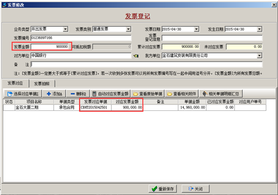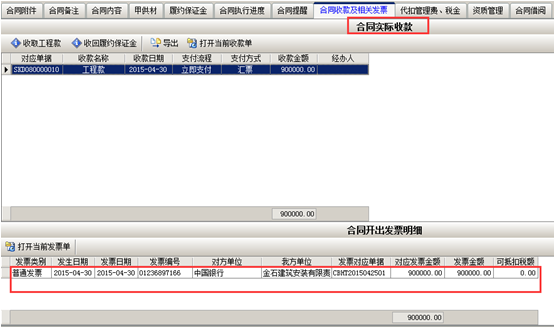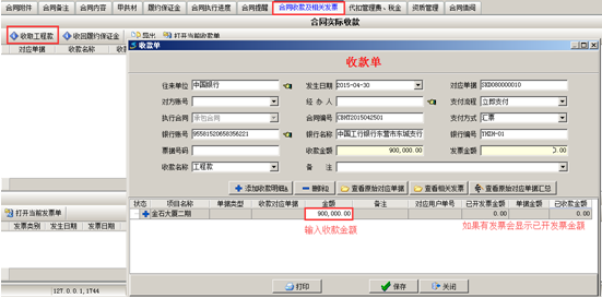 合同收款時點擊“合同收款及相關(guān)發(fā)票”,點擊“收取工程款”彈出收款單,填寫收款單詳細(xì)信息,輸入收款金額,如果有開發(fā)票需在“發(fā)票管理”添加發(fā)票信息并對應(yīng)好合同號: