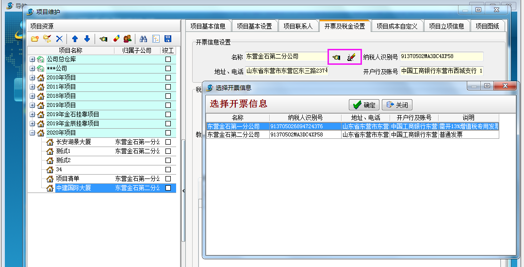 3、項目維護設(shè)置歸屬子公司后會自動帶入開票信息。
