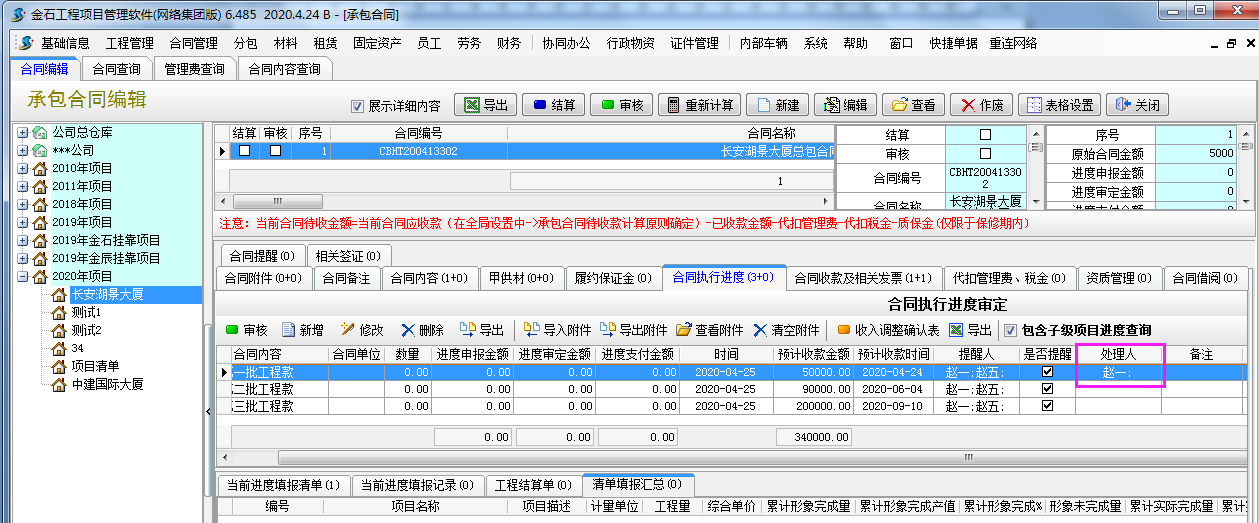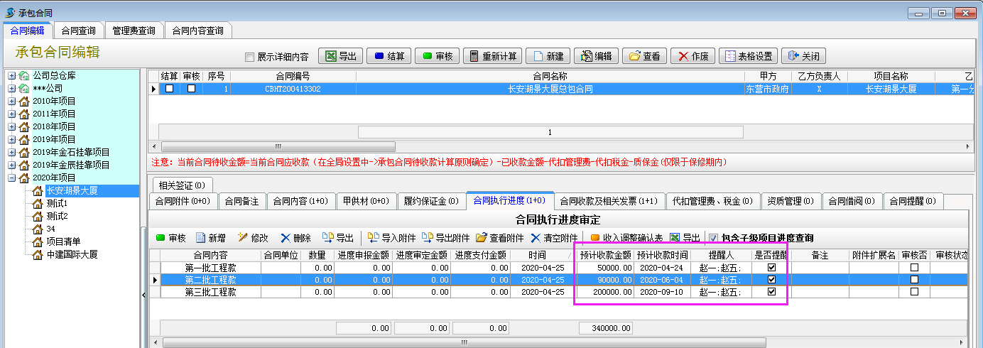 1、在【工程管理】-【承包合同】-合同執(zhí)行進度,點擊新增,填寫預計收款金額、預計收款時間、提醒人、是否提醒。