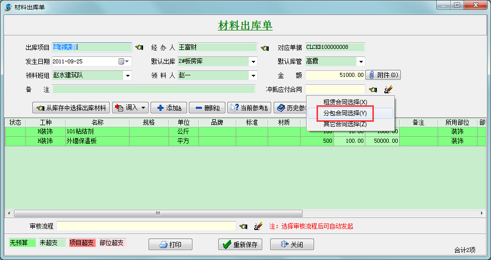 選定對應合同后,點擊保存,這樣就可以實現分包工程款的沖抵。