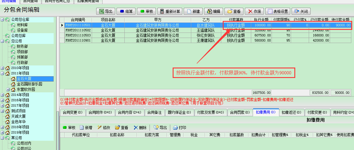 在工程項目管理中,工程款含甲供材費用的情況經常會遇到,若總包方對外分包而且分包款也是包含甲供材費用的話,同樣的在分包管理中就應該在分包工程款中扣除相應的甲供材費用。或者我方給分包商提供材料。為此金石工程項目管理軟件中做出相應的解決方案,以下為示例說明