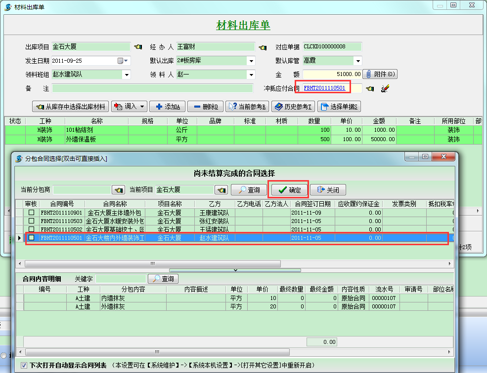 甲供材到達現場倉庫后,由分包商(領料班組)領走,此時做相應的出庫單,在出庫單中我們勾選沖抵應付合同,并選擇對應的分包合同,如下圖所示,