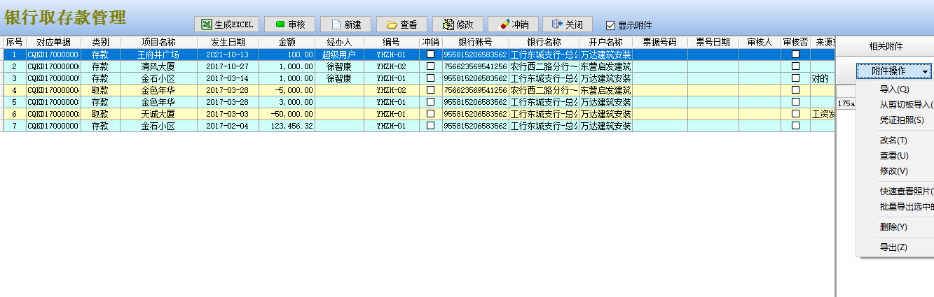 銀行存取款管理,右側增加附件的導入等功能。支持附件的導入,刪除等功能。
