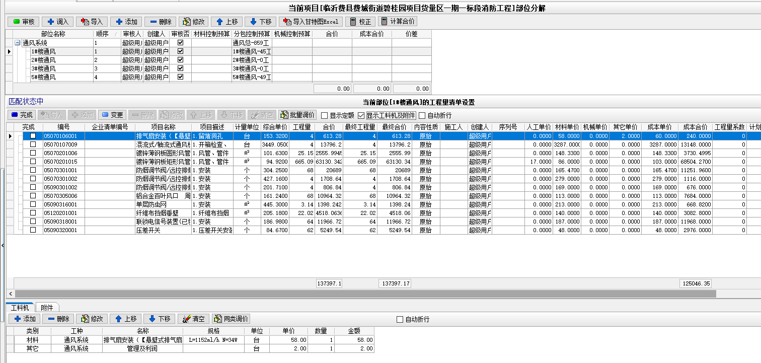 工程管理模塊下,【部位分解及工程量清單】中,部位部位分解中增加‘合價’、‘成本合價’和‘價差’三個字段,旨在體現出當前部位下合同清單金額、成本清單金額(由企業(yè)清單中工料機計算得出)和兩者的差值形成的價差(實際就是利潤)。如下圖所示