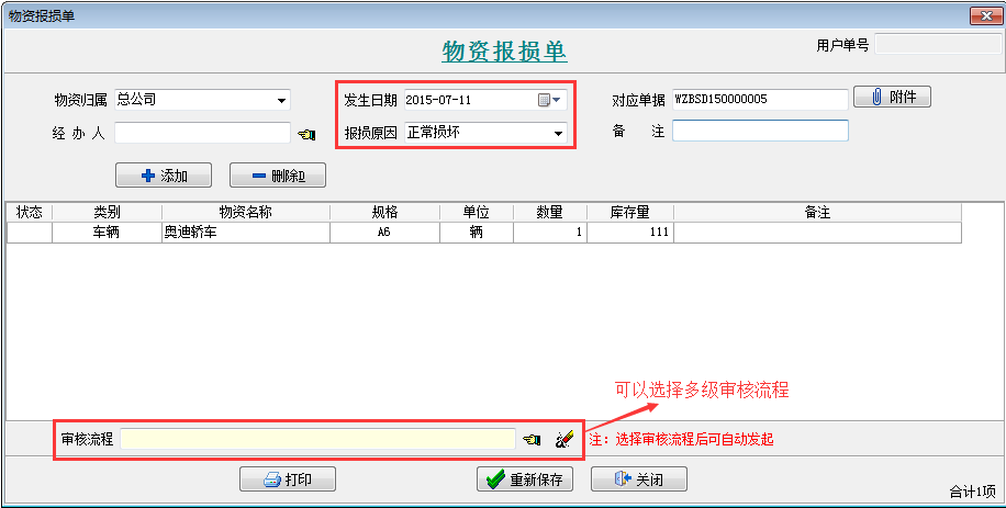 【物資報損單】是用來報損物資的業務單據。 類似【材料報損單】或者【設備報損單】,一個是針對物資報損,一個是針對材料或者設備報損。