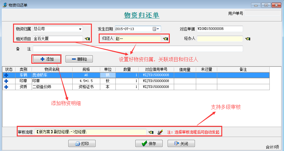 點擊主菜單中的【行政物資】->【物資歸還單】打開物資歸還單列表 點【新建】按鈕,錄入如下: