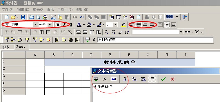 5. 雙擊第一行輸入,在彈出的文本框中,輸入打印標題的名稱例如材料采購單。然后選擇字體及大小。