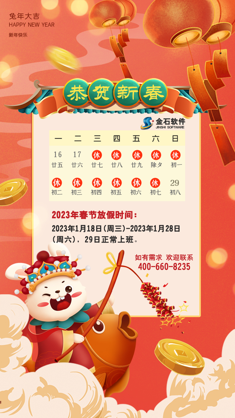 金石軟件茲定于2023年1月18日開始新春假期,1月29日日恢復營業(yè),假期雖至,如您有需求仍可以撥打400-660-8235或您所知曉的軟件工程師電話獲取服務。
