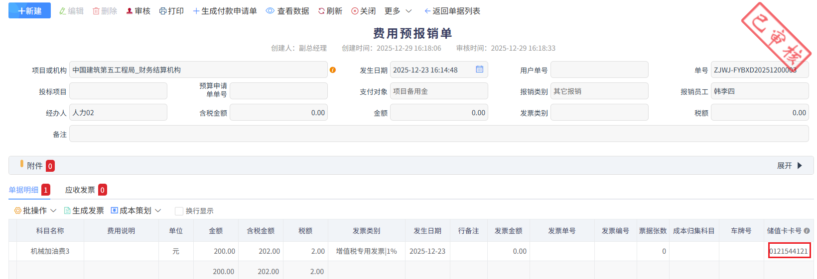 儲值卡核銷問題,需要經辦加油的人,做費用預報銷單,關聯儲值卡號,如下圖所示,