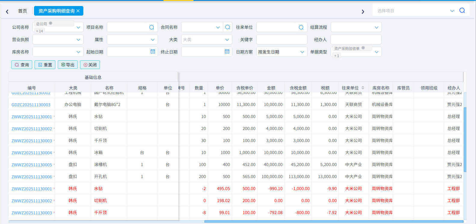 (4)資產(chǎn)采購明細(xì)查詢(紅色字體為資產(chǎn)退貨)