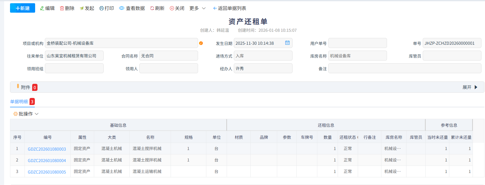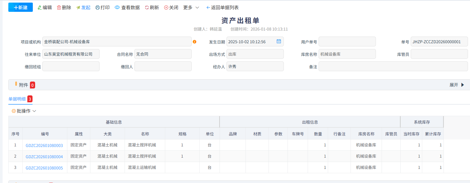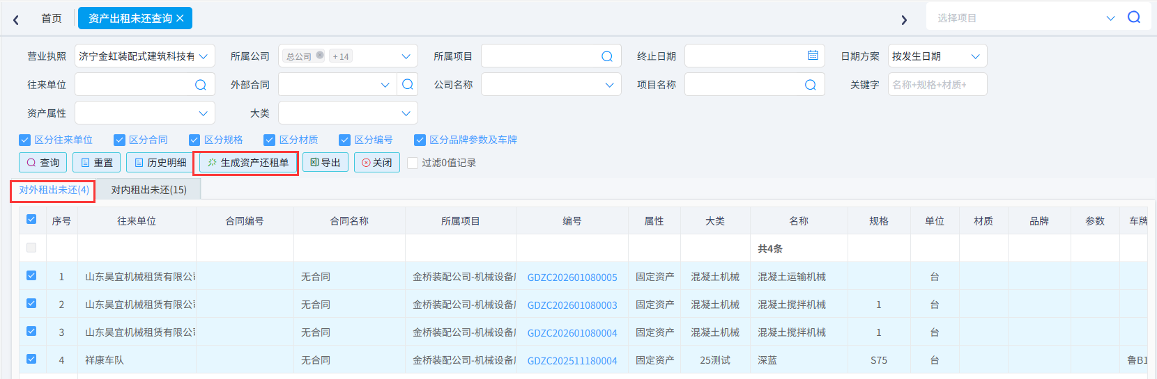 系統(tǒng)對(duì)內(nèi)出租與對(duì)外出租分開展示一目了然且支持在查詢內(nèi)快捷生成資產(chǎn)還租單