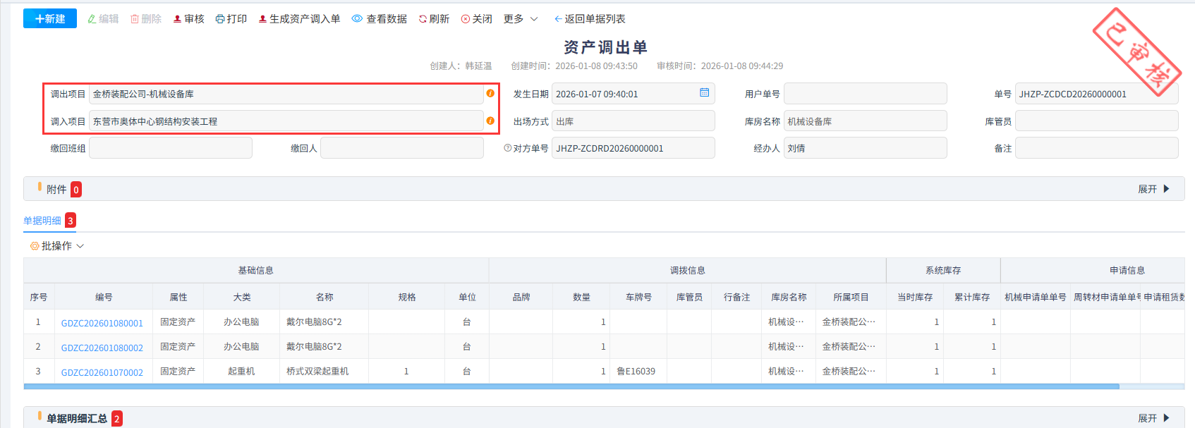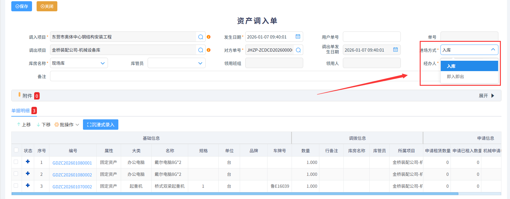 資產(chǎn)調(diào)入是指企業(yè)將資產(chǎn)從其他項(xiàng)目、部門或倉庫轉(zhuǎn)入特定使用地點(diǎn)的流程,資產(chǎn)調(diào)入單須通過已審核的資產(chǎn)調(diào)出單生成,生成過程中調(diào)入方可根據(jù)實(shí)際情況選擇入庫和即入即出(此選項(xiàng)不進(jìn)入庫房,領(lǐng)用無需出庫)