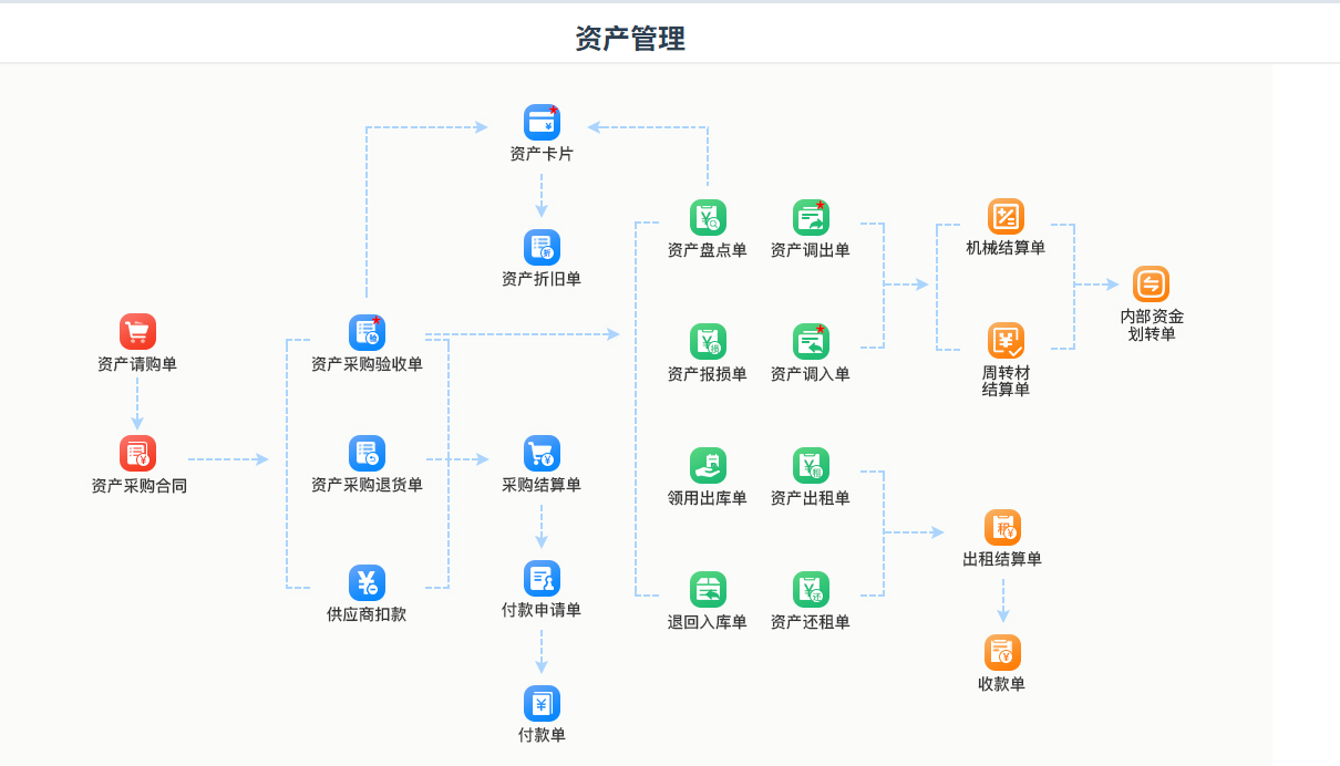 資產(chǎn)管理是公司的固定資產(chǎn)的管理,包括資產(chǎn)的采購、日常維修和保養(yǎng)、報(bào)損、折舊、項(xiàng)目調(diào)撥、在各項(xiàng)目的分布,針對(duì)公司內(nèi)部的使用成本核算,也可以用于對(duì)外出租產(chǎn)生收入(相關(guān)單據(jù):【資產(chǎn)出租單】,【資產(chǎn)還租單】,【資產(chǎn)出租結(jié)算單】