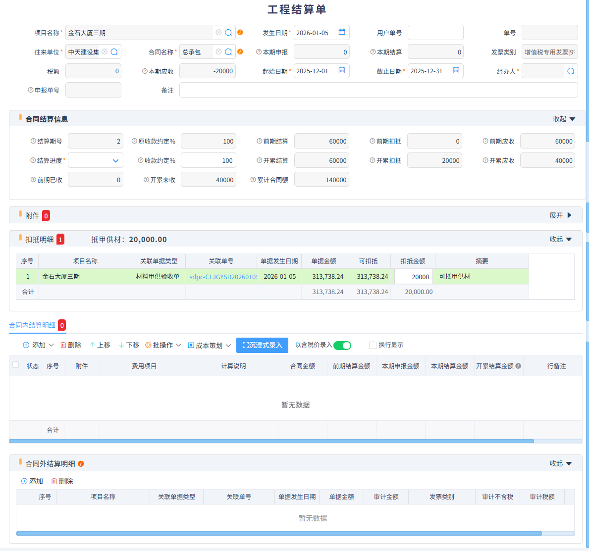 在與甲方結(jié)算時(shí)會(huì)自動(dòng)扣除甲供材,扣抵金額可以自行輸入,分多次扣抵。
