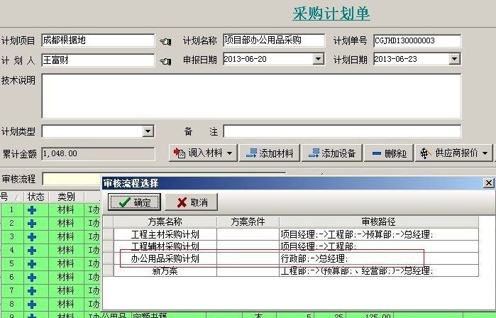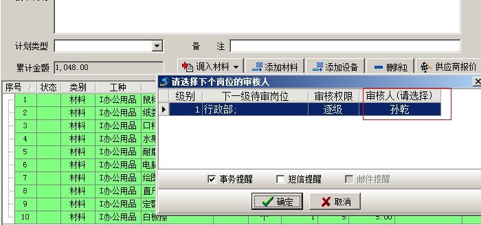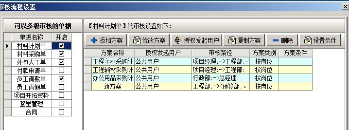 6. 業務單據是多級審核,審核流程中的待審核用戶不受限制。審核流程設置是在系統維護模塊,【審核流程設置】中進行設置。如下圖:左側是單據名稱列表,右側是單據審核的各種方案。