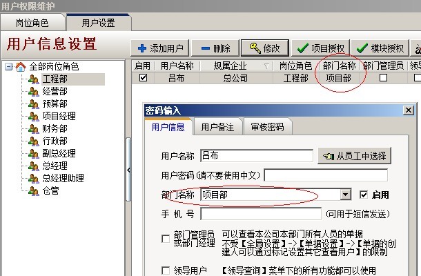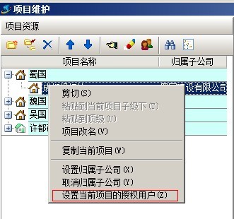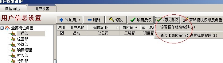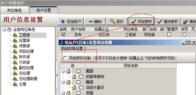 C:項目授權判斷,是指判斷該用戶是否有項目授權,在系統維護模塊中【用戶管理權限設置】和項目維護中都可以進行設置用戶項目授權。設置方法如下圖: