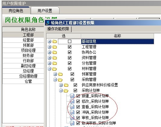 A:模塊授權判斷,是指用戶針對相關業務單據所擁有的基礎操作授權,如:業務單據的新建、修改、刪除、查看等。是在系統維護模塊中【用戶管理權限設置】進行設置,只要給先做好【崗位角色】授權,然后給用戶選擇相應崗位即可。如下圖:
