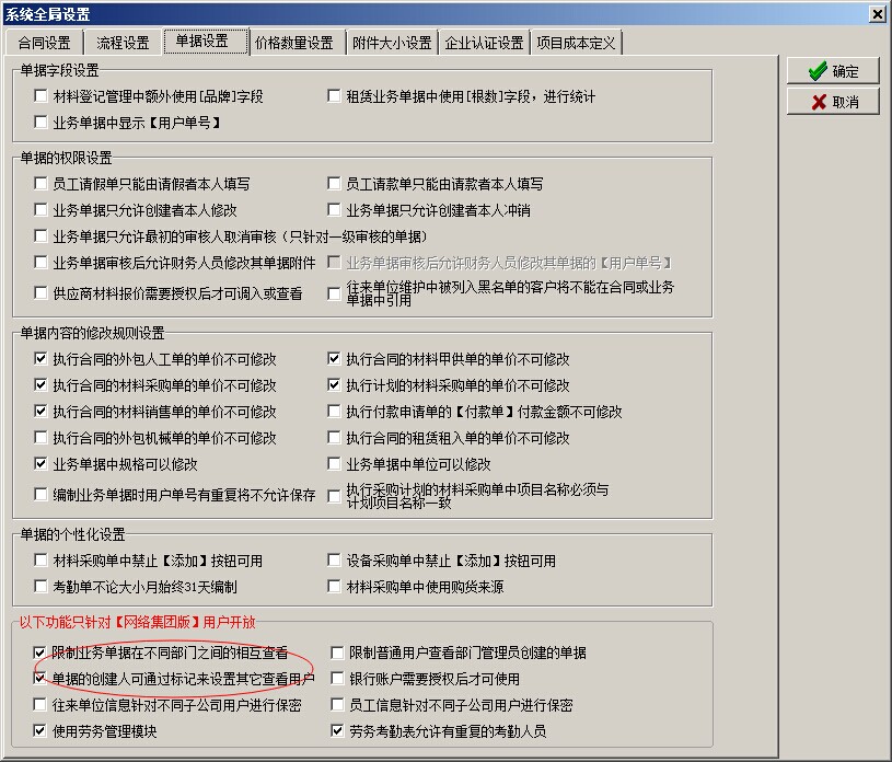 在工程項目管理軟件(集團版)中,存在一些設置(開關),使業務單據的訪問存在一定限制,只有在滿足條件的。用戶才能查看到該業務單據。如下圖: