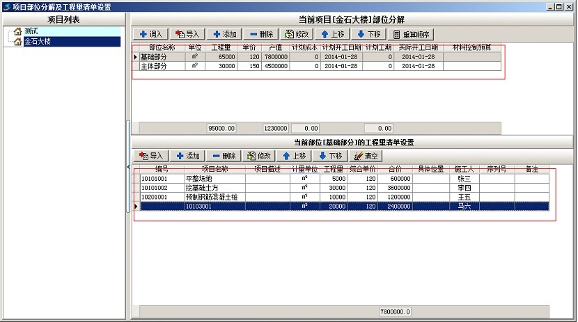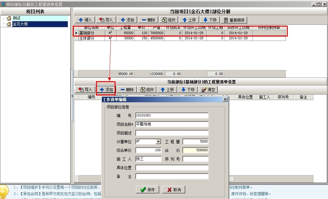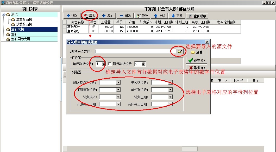 上圖是工地常用部位劃分的部分清單內容,下面以上面截圖為例說明軟件中工程的部位劃分,首先新建項目金石大樓