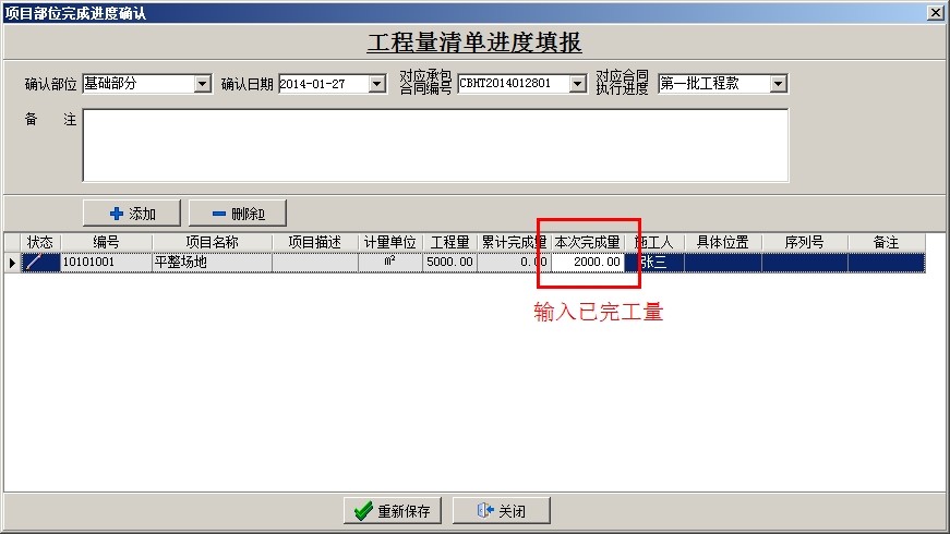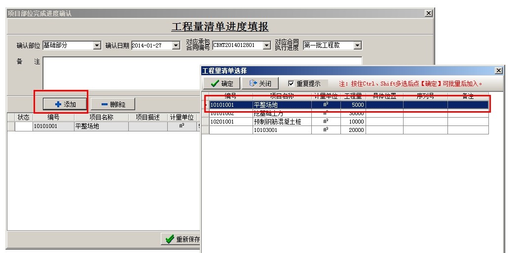 選中相應的項目,點擊新建,填出工程量進度填報窗口,選擇部位名稱,可以選擇關聯項目對應的承包合同號和承包合同執行進度,然后點添加,調入清單內容,在本次完成量處輸入已完成的工作量,不限制錄入進度填報,直至清單工作量完成,調入下一項清單內容(如某項清單實際工程量超過清單預算量,可以繼續填報)